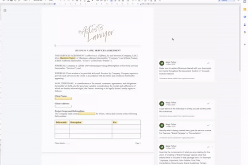 –Peace of Mind Guarantee: Every template, document, and business tool was crafted by The Artists’ Lawyer: Magi Fisher, Esq., a licensed attorney and seasoned entrepreneur. Our offerings are tailored to your business and the unique needs of your industry. Long story short: We’d never sell anything we wouldn’t use ourselves (and depending on the template, there’s a good chance we have!).